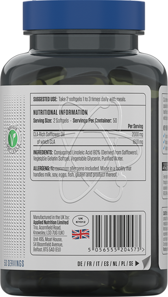 Ta din träningsrutin till nästa nivå med Applied Nutrition CLA Gold 1000! Varje dagsdos innehåller 2000 mg safflorolja rik på CLA (konjugerad linolsyra), varav 1600 mg är ren CLA. Med bara två växtbaserade softgels per dag får du en av de mest använda ingredienserna inom sportnäring.