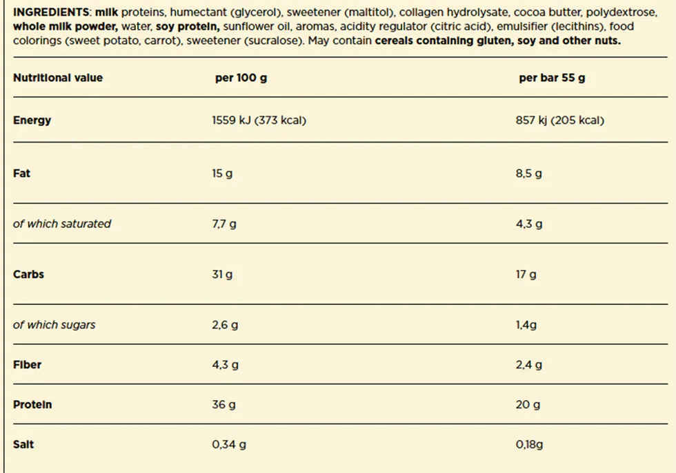 • 20 gram protein per bar för att stödja muskeltillväxt och underhåll