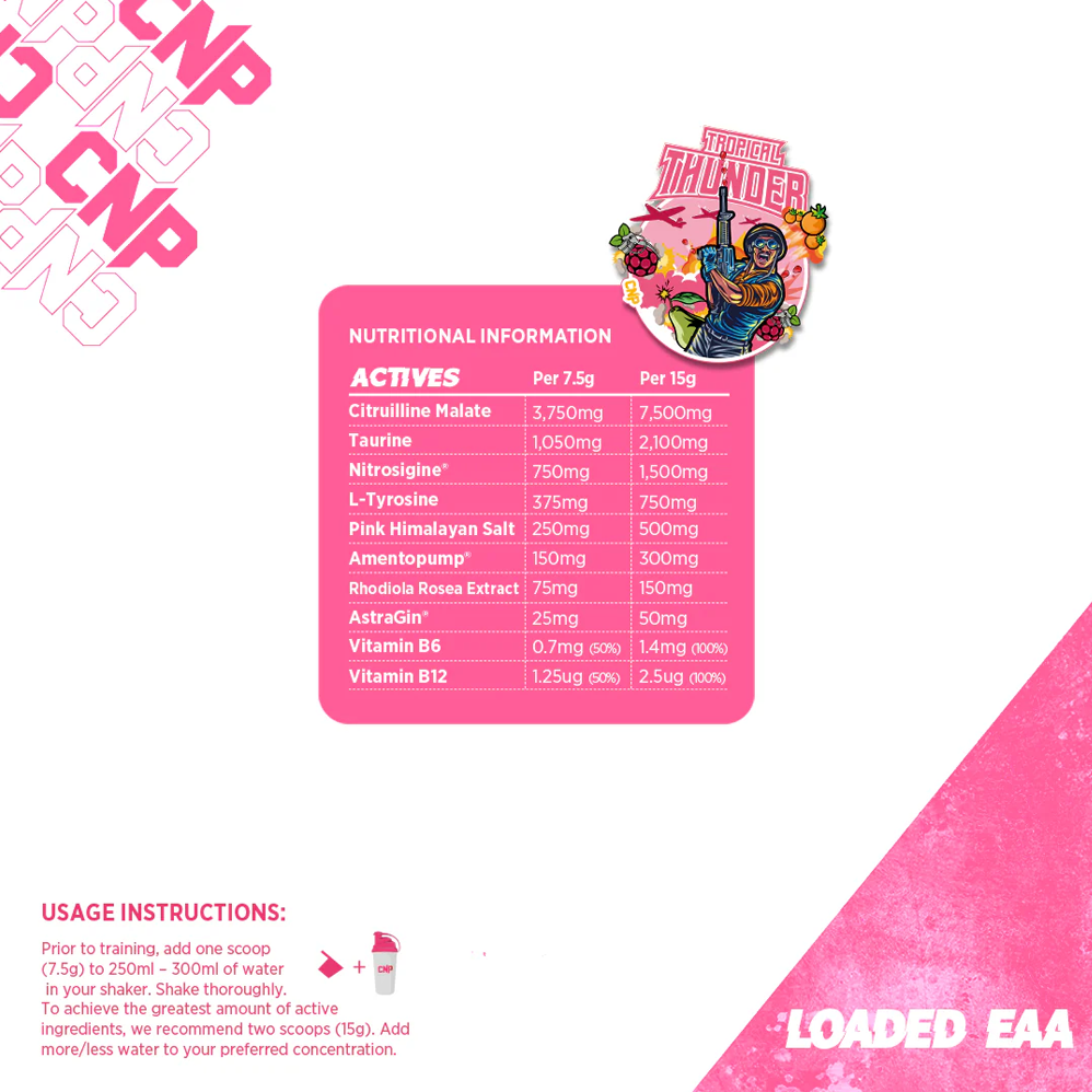Varje skopa innehåller 3,7 g Citrulline Malate, 1 g Taurin, samt 375 mg L-Tyrosin för ökad fokus. Formulan är dessutom berikad med Nitrosigine®, AmentoPump® och Pink Himalayan Salt – ett kraftpaket som ger pump på 10/10-nivå. Vitamin B6 och B12 bidrar till minskad trötthet och stödjer normal energiomsättning.