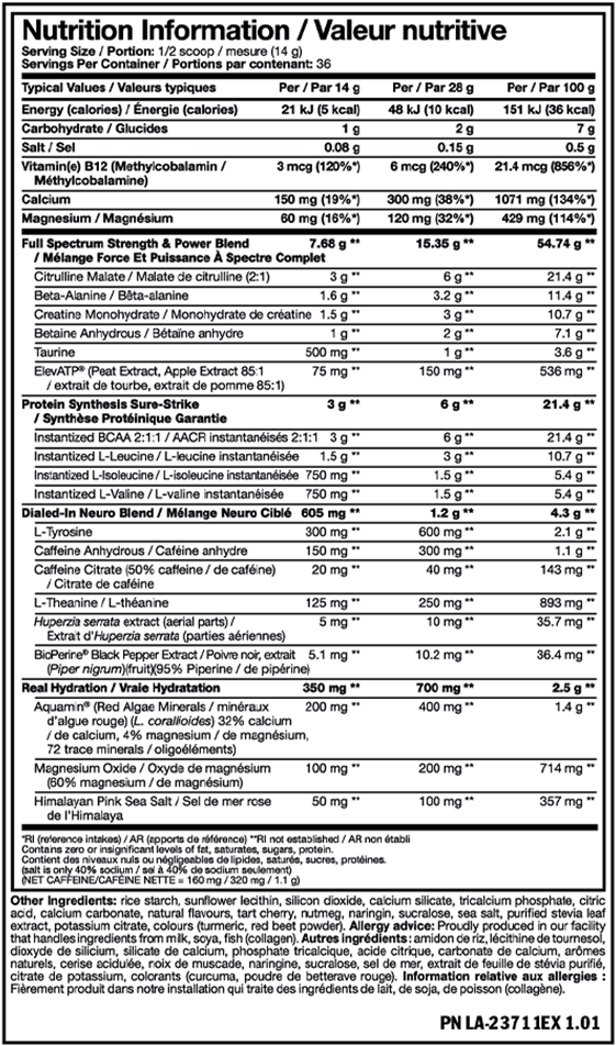 Strength & Power Blend: 6 g Citrullin Malat, Beta-Alanin, Betaine Anhydrous, Taurin, ElavATP® samt 3 g Kreatin för explosiv styrka och uthållighet