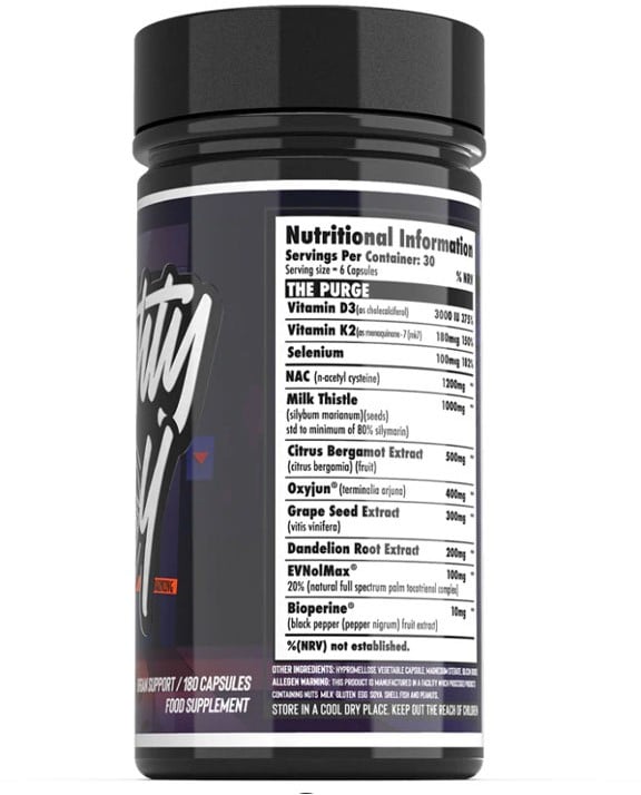 Naughty Boy Purge är ett avancerat kosttillskott utformat för att ge omfattande kroppsstöd med hjälp av kraftfulla och välvalda ingredienser. Varje portion innehåller en effektiv blandning av 1200 mg NAC, 1000 mg Mariatistel, 500 mg citrusbergamott-extrakt samt 300 mg druvkärnextrakt. Formulan är dessutom förstärkt med vitamin D3 och K2 – perfekt för dig som vill stärka din dagliga hälsorutin.