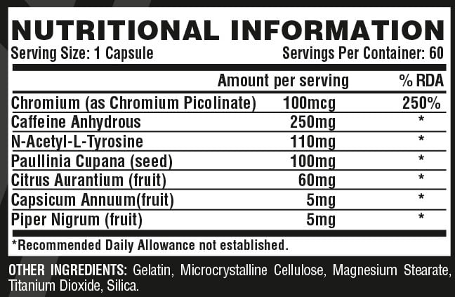 Innehåller koffein anhydrous, N-acetyl-L-tyrosin och kraftfulla växtextrakt