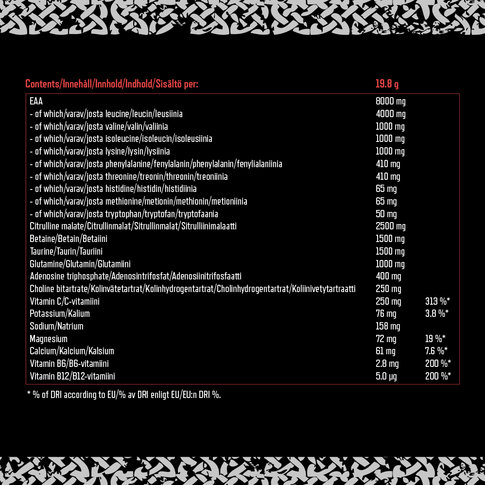 Men det är inte bara aminosyrorna som gör denna formula kraftfull – Sleipner EAA är även berikad med 400 mg ATP, 1500 mg betain, 2500 mg citrullinmalat, taurin, elektrolyter, samt vitaminerna B6, B12 och C. Förbered dig på att känna riktig vikingastyrka!