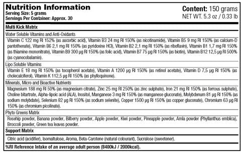 Stacker2 Multi Kick är ett praktiskt och uppfriskande multivitaminpulver – perfekt för dig som föredrar ett alternativ till tabletter och kapslar. Med en god apelsinsmak kombinerar denna formula 32 aktiva ingredienser, inklusive viktiga vitaminer, mineraler och en näringsrik phyto-greens-blandning av frukt- och grönsaksextrakt.