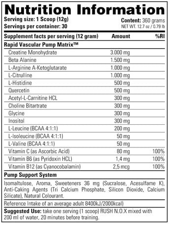 Tillsammans med 1,5 g beta-alanin, 1 g arginin AAKG och 1 g citrullin skapar Rush NOX en perfekt grund för ökad blodgenomströmning och uthållighet. Dessutom är produkten berikad med vitamin B6, som bidrar till normal energiomsättning och minskad trötthet, samt vitamin C, som hjälper till att skydda cellerna mot oxidativ stress.