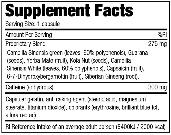 Innehåller grönt te, guarana, yerba mate och kola-nöt